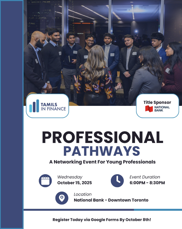 Tamils in Finance’s Professional Pathways is a signature networking event created for young professionals, students, and recent graduates interested in exploring careers in finance.